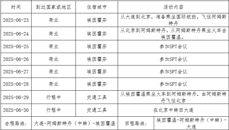 应埃因霍温理工大学、SPT会务组邀请,我单位于雪拟赴荷兰国家(地区)进行工作访问(学术交流)。现将该团组拟出访情况公示如下: