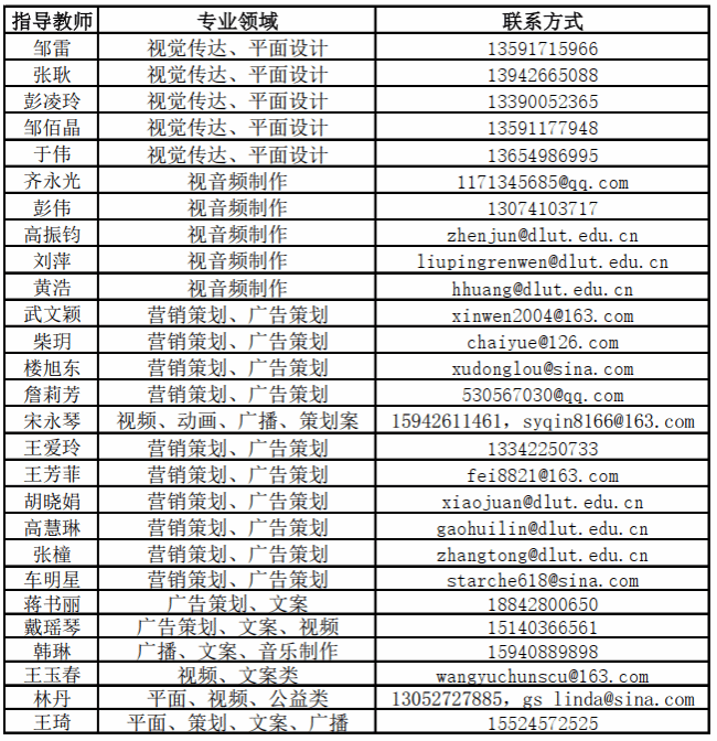 第十七届老员工广告艺术大赛太阳成集团tyc122ccvip官网入口选拔赛组委会提供有关指导老师的名单及联系方式,参赛同学可根据作品种类自行联系指导老师(请短信或邮件形式联系指导教师)。