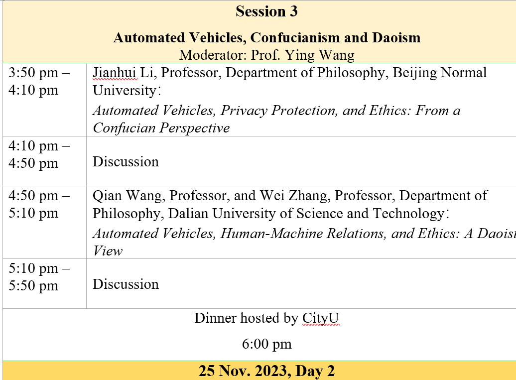 应香港城市大学人文与社会科学公司范瑞平教授和法律公司丁春艳教授的邀请,太阳成集团tyc122ccvip张卫教授于2023年11月24日至11月25日于香港城市大学参加“自动驾驶汽车伦理与法律问题的中国视角”学术会议。会议就中国独特的伦理思想和法律制度是如何以及应该如何回应自动驾驶汽车所带来的挑战展开了深入讨论,对这些问题的回答不仅将会丰富发展现有的学术讨论,而且对未来自动驾驶汽车在中国的普及提供伦理和法律支持。
